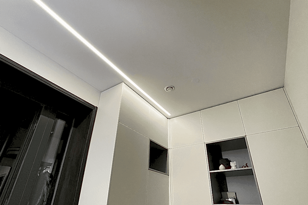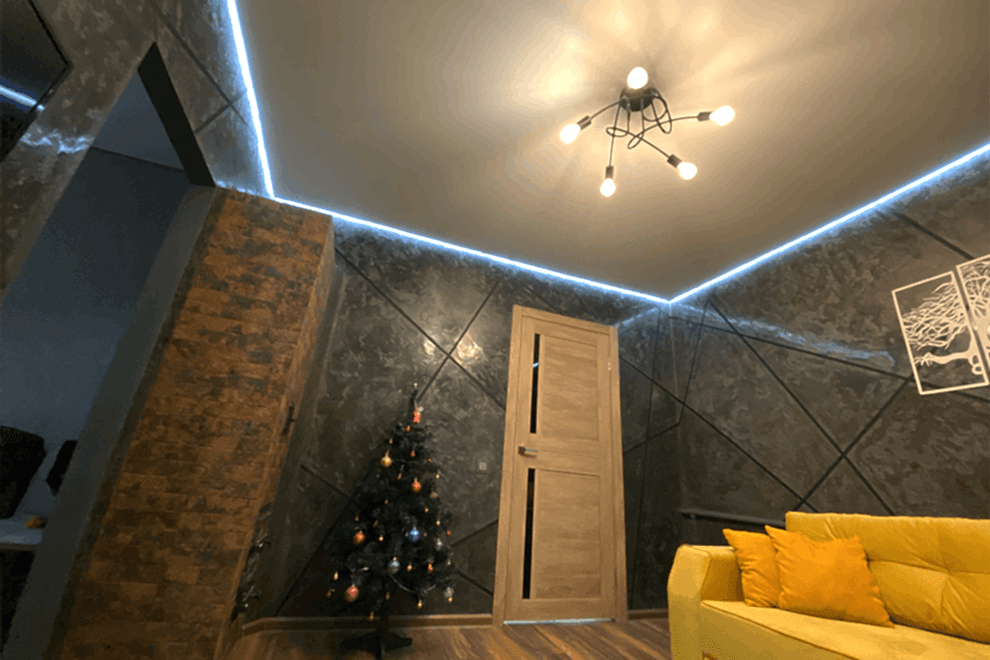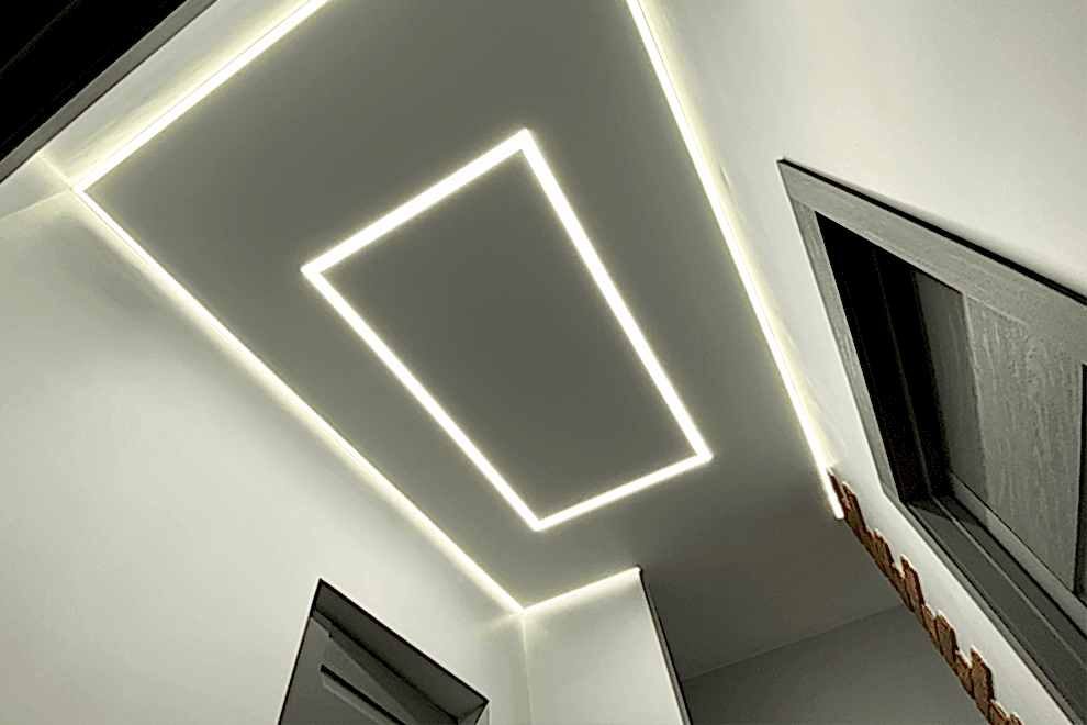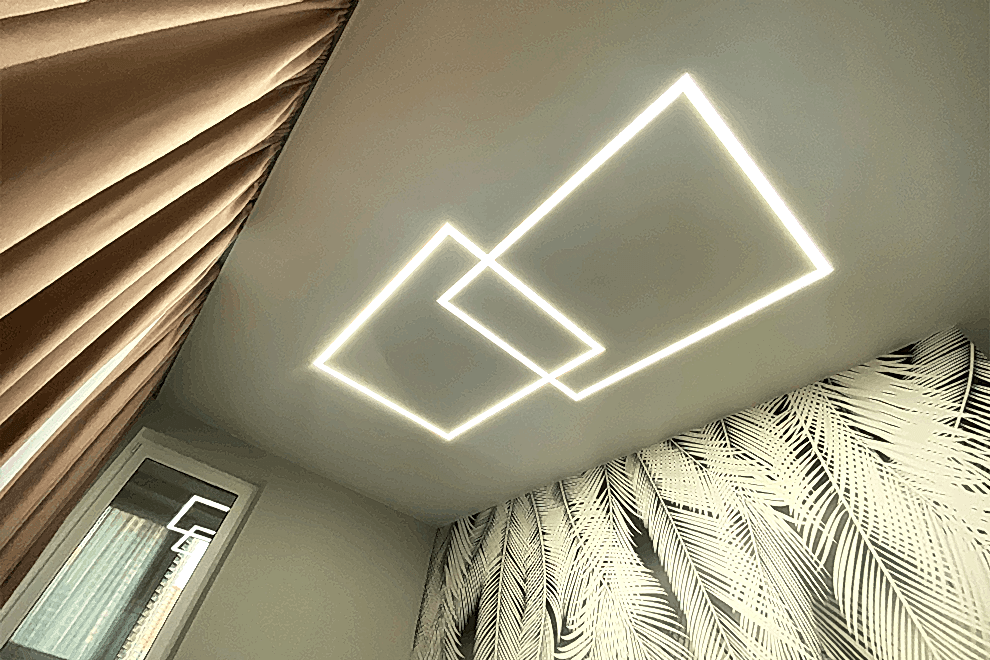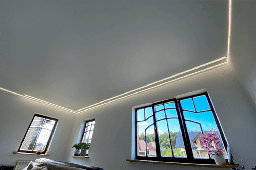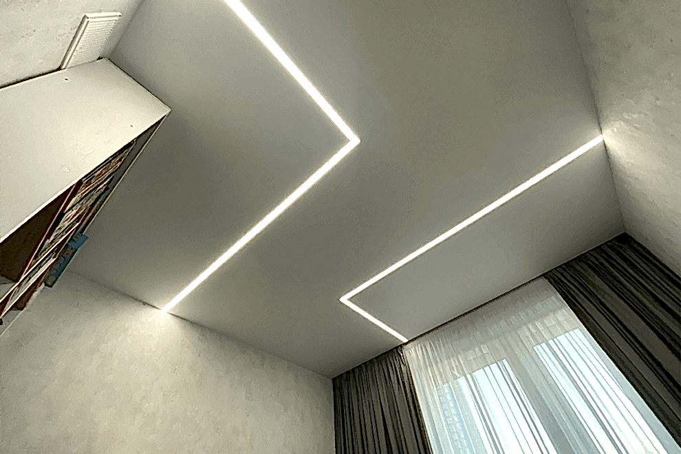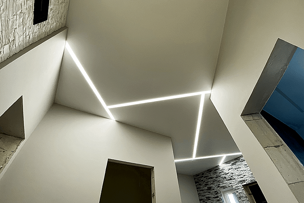 LED strips represent a type of ceiling construction where the LED tape is embedded into a special profile, covered with a light-transmitting cover, allowing the light to diffuse across the ceiling.
