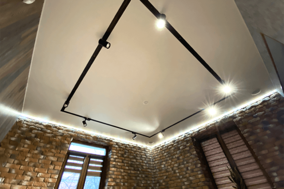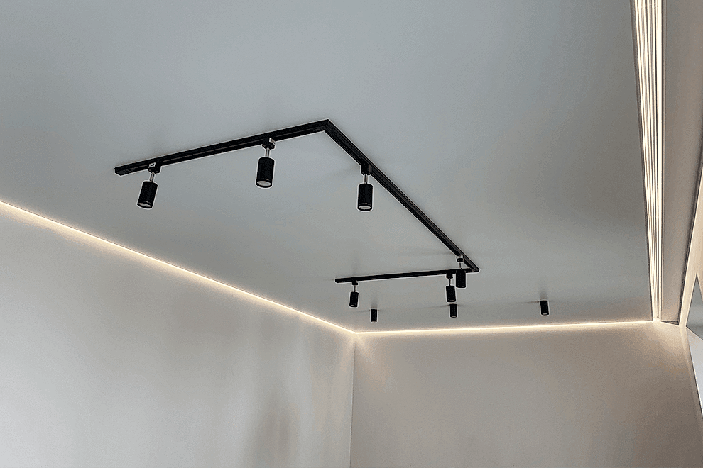 Track lighting is an excellent solution for creating high-quality and versatile illumination. The track system operates on the principle of allowing the light fixture to freely move along a conductor with current (track) and connect to the power source at any point.