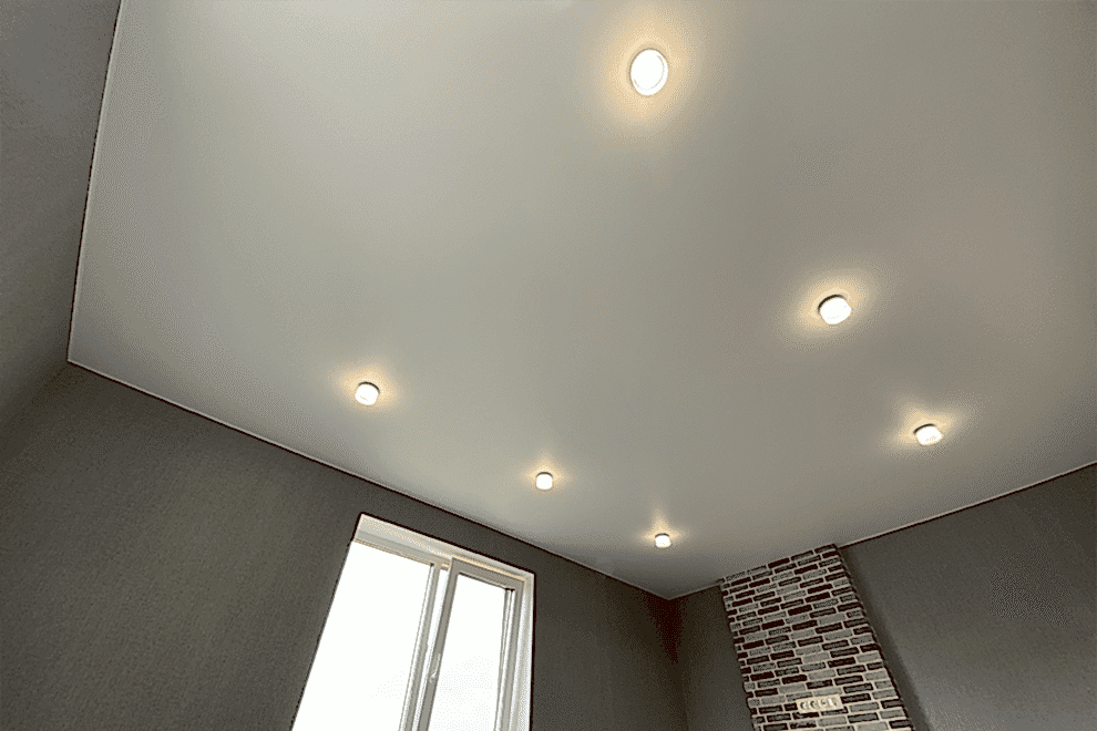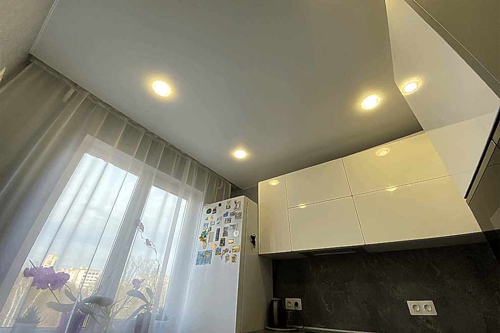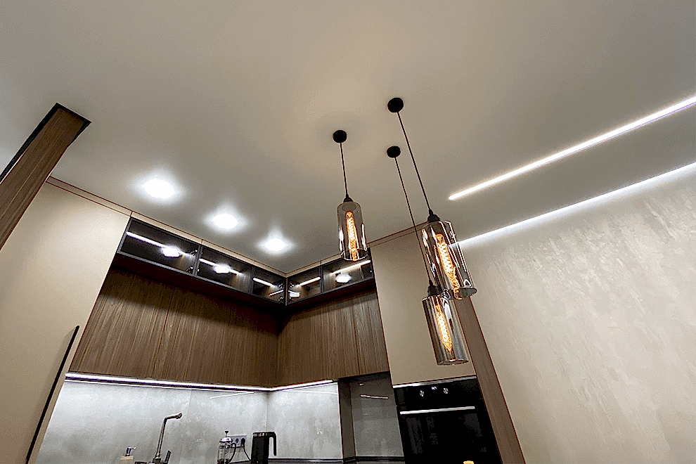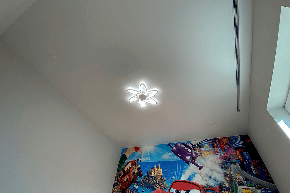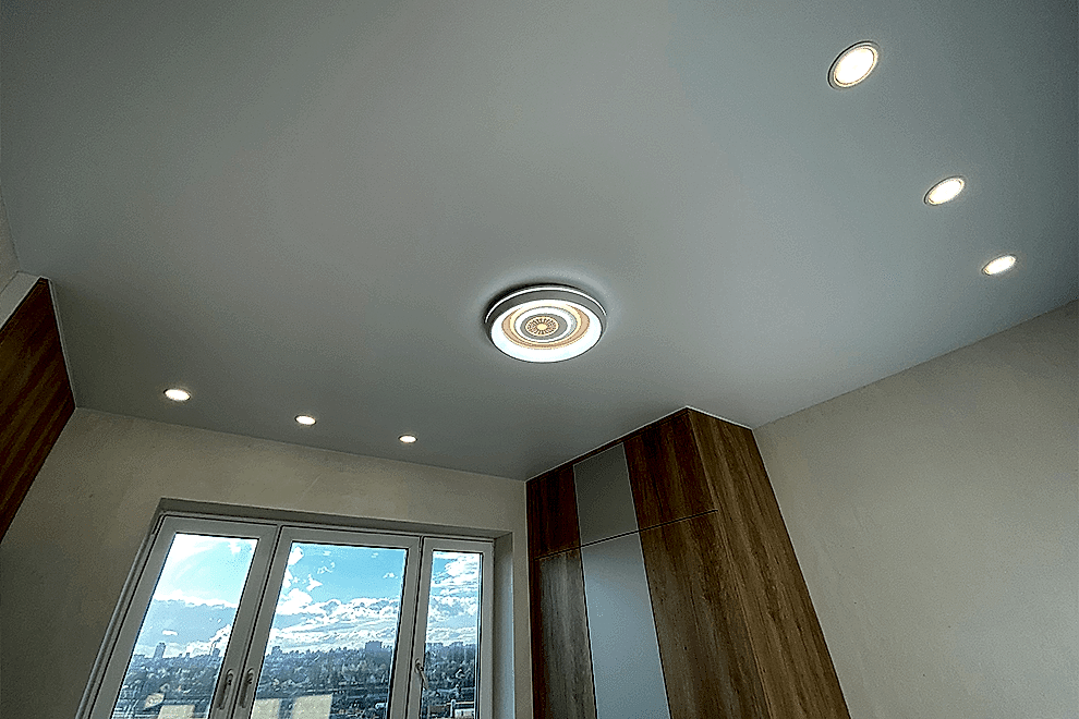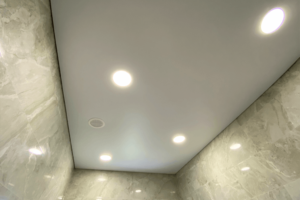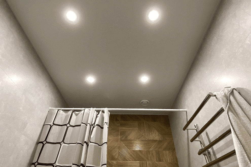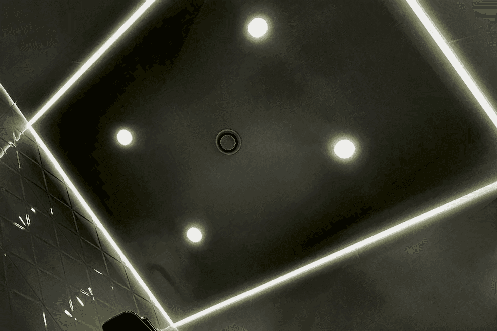 Recessed light fixtures are lights that are installed directly into the stretch ceiling, creating the effect of hidden illumination. Thanks to their built-in design, these fixtures provide even lighting, prevent the formation of shadows, and create a comfortable atmosphere.