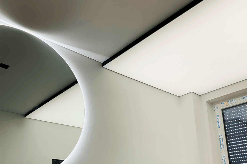 The floating lines along the perimeter of the stretch ceiling impart an airy feel to the space, creating a sense of weightlessness.